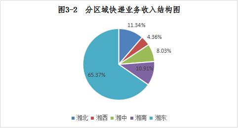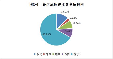 1-7月,湘北(岳阳、常德、益阳)、湘西(湘西州、怀化、张家界)、湘中(娄底,邵阳,湘潭)、湘南(衡阳,郴州,永州)、湘东(长沙、株洲)地区快递业务量比重分别为12.59%、2.92%、8.24%、9.44%、66.81%;快递业务收入比重分别为11.34%、4.36%、8.03%、10.91%、65.37%。