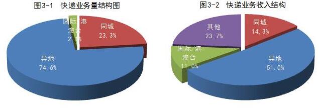 上半年,同城、异地、国际/港澳台快递业务量分别占全部快递业务量的23.3%、74.6%和2.1%;业务收入分别占全部快递收入的14.3%、51%和11%。与去年同期相比,同城快递业务量的比重下降1.2个百分点,异地快递业务量的比重上升1.2个百分点,国际/港澳台业务量的比重基本持平。