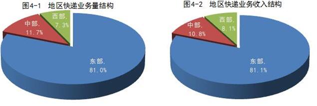 上半年,东、中、西部地区快递业务量比重分别为81%、11.7%和7.3%,业务收入比重分别为81.1%、10.8%和8.1%。与去年同期相比,东部地区快递业务量比重下降了0.1个百分点,中部地区快递业务量比重下降了0.2个百分点,西部地区快递业务量比重上升了0.3个百分点;东、中、西部地区间快递业务收入比重基本持平。